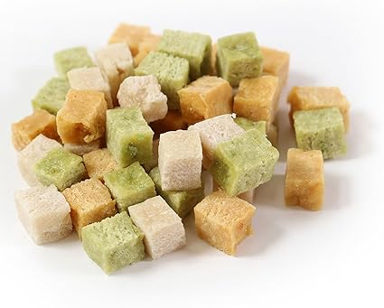 ミルク入り、さつまいも入り、ほうれん草入り、3つの味を楽しめる小粒なキューブジャーキー。