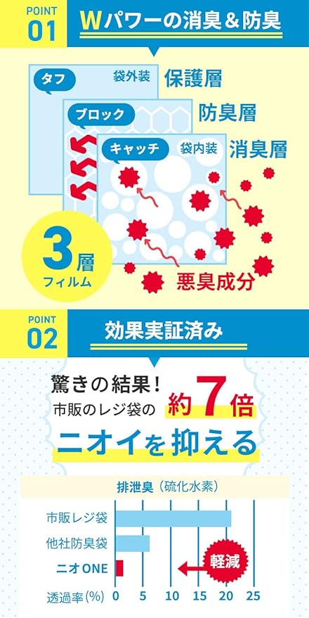 【他とは違う3層構造】 保護層、防臭層、消臭層の3層構造。 消臭と防臭のフィルムが別々に存在することで、様々な悪臭成分を効果的に遮断。