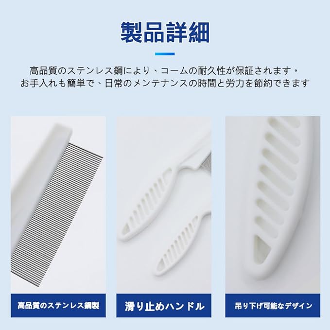 ペットコーム ノミ取り櫛 犬猫用櫛 【2本、18cm+14cm】犬猫美容ブラシ 水洗いOK 衛生的 丸い先端 傷つけにくい ステンレス製犬猫用櫛 のみとりくし ホワイト a