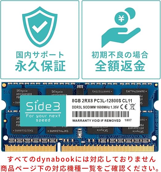 Side3 TOSHIBA dynabook ノートPC用メモリ PC3L-12800 8GB (DDR3L 1600Mhz) 1.35V (低電圧) - 1.5V 両対応 a