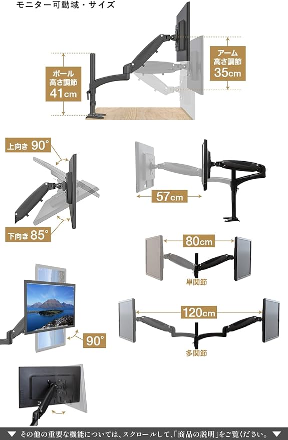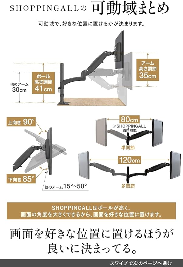 【 他社より画面が見やすい 大企業が評価 】労働環境、生産性管理に厳しい大企業から評価された画面の見やすさ。いくつもの大手企業が500台以上導入。日本企業200社以上が導入したモニターアーム。画面の見やすさは最上級なのに、価格は高級モニターアームの約半分。※一流メーカーとSHOPPINGALLの各機能はスクロールして、「商品の説明」をご覧ください。【 日本とカナダで評価されてます 】カナダ評価4.4オーバー(2022.3.01時点)。日本有名メディアに多数掲載。累計販売数10万台突破。総売り上げ