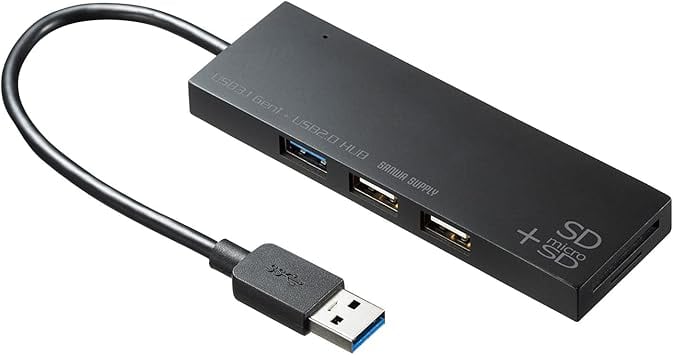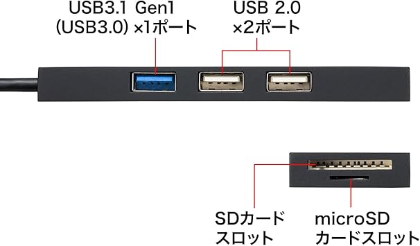 USB3.2 Gen1(USB3.1/USB3.0)×1ポート、USB2.0×2ポートのコンボハブにSDカードスロットとmicroSDカードスロットが付いた便利なハブです。