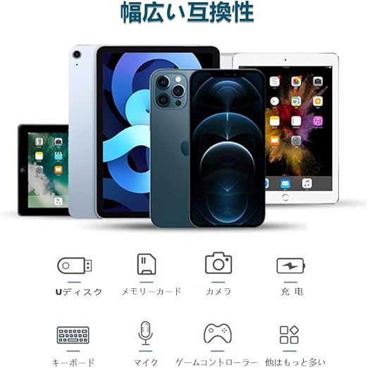 【4-in-1 SDカードリーダー】:4-in-1 iOS用 SDカードリーダーは1つのSDカードポート、1つのMicro SDカードポート、1つのUSBポート、1つの充電用IOSコネクタメスをサポートしています。写真やビデオをiPhone やiPadに簡単に転送できます。データを転送中しながら充電することもできます