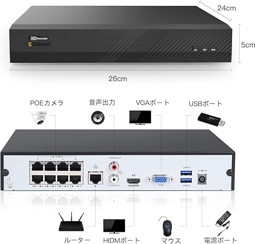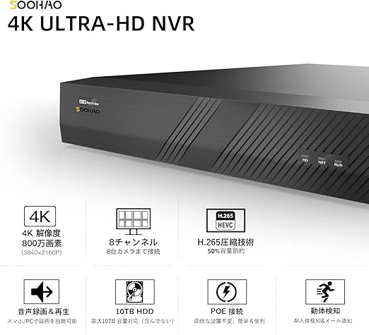 SOOHAO 防犯レコーダー 防犯録画機 NVRビデオレコーダー 防犯カメラ対応 4K 8CH H.265画像圧縮方式 モーション検知 遠隔監視 メール警報 Ipad/iPhone/Android スマートフォン対応 HDDなし a