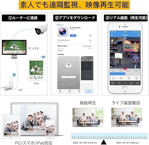 【アプリの遠隔監視】QRコードをスキャンしてアプリをダウンロードします。iPhone/Android/PC Windowsのブラウザで遠隔監視もできます。