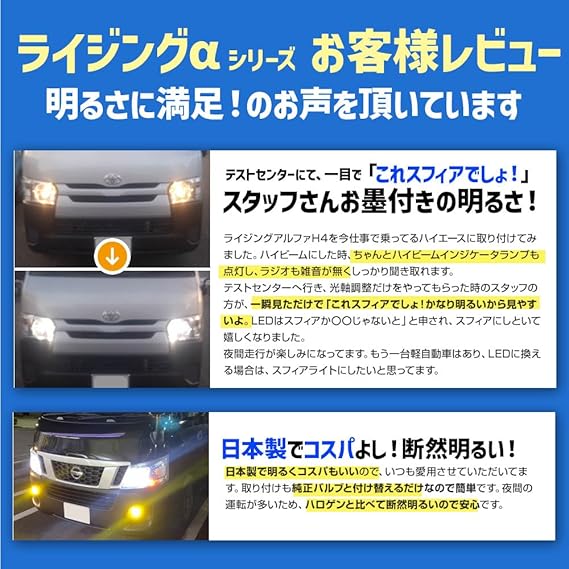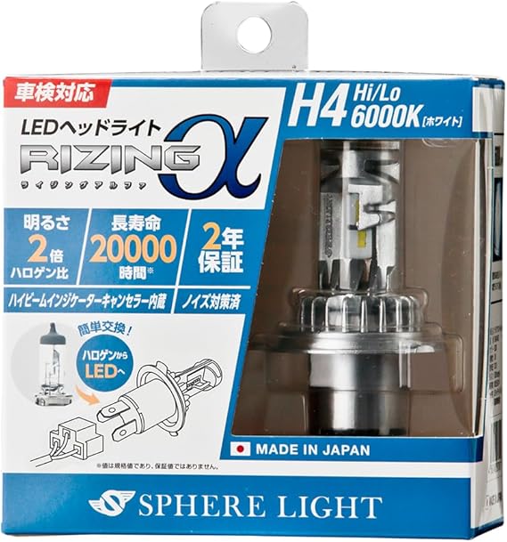 スフィアライト H4 Hi/Lo LED ヘッドライト RIZINGα 3600lm ロービーム 車検対応 6000K ホワイト 白 12V 日本製 純正サイズ 簡単取付 ノイズ対策済 ライジング アルファ LEDバルブ SPHERELIGHT SRACH4060-02 a