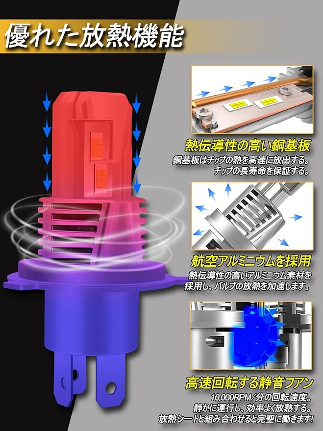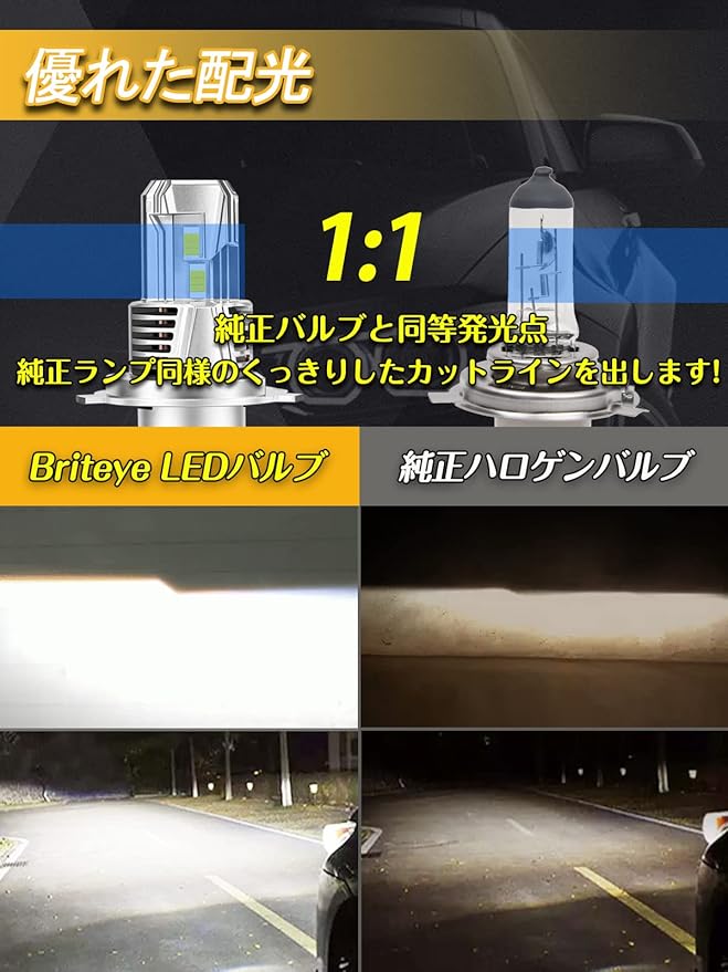 【超爆光H4ledヘッドライト】市販されている大光量のH4LEDライトに比べ、小型化しながらも高輝度を実現しました。最先端の7035LEDチップを搭載し、40Wの高発光効率を実現しています。純正ハロゲンバルブに比べて輝度を300%にUP。従来のledバルブに比べて2~3倍の明るさを実現!純正電球を交換するだけで、視認性もハロゲンより驚くほど高い。ドライバーに最高の視認性を提供する。より明るさとカットラインのシャープさをお求めのお客様にお勧めします!