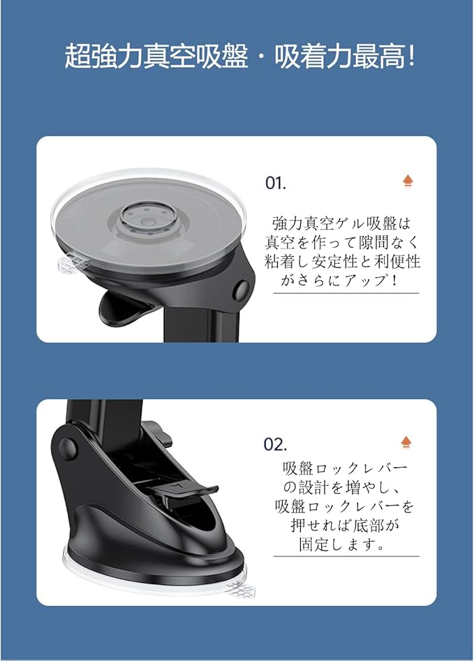 最新改良された超強力真空粘着ゲル吸盤を採用、3M吸盤シートも付き、吸着力が倍増し、ダッシュボードや窓など平らな場所でも取り付けられます、車の表面の革を傷つけず、跡も残らないです。