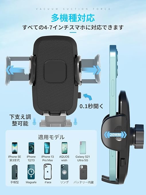 車用スマホホルダーは横幅6㎝-10.5㎝の端末に対応、下支えもスライド式なので、iPhone/Samsung/Galaxy/Sony/Xperia/LG/SHARP/Xi